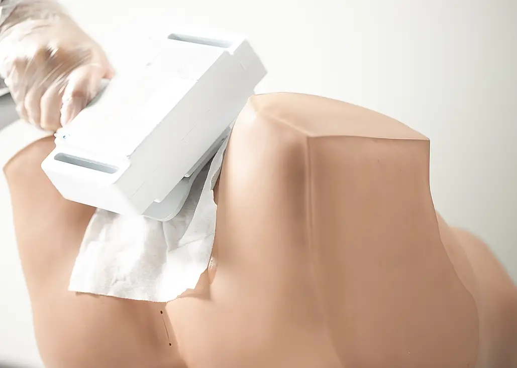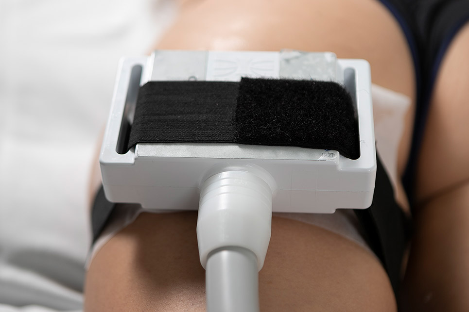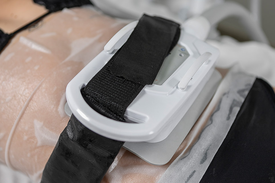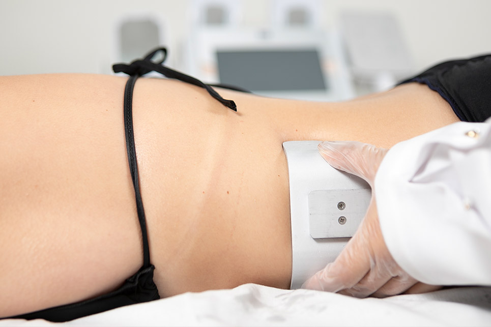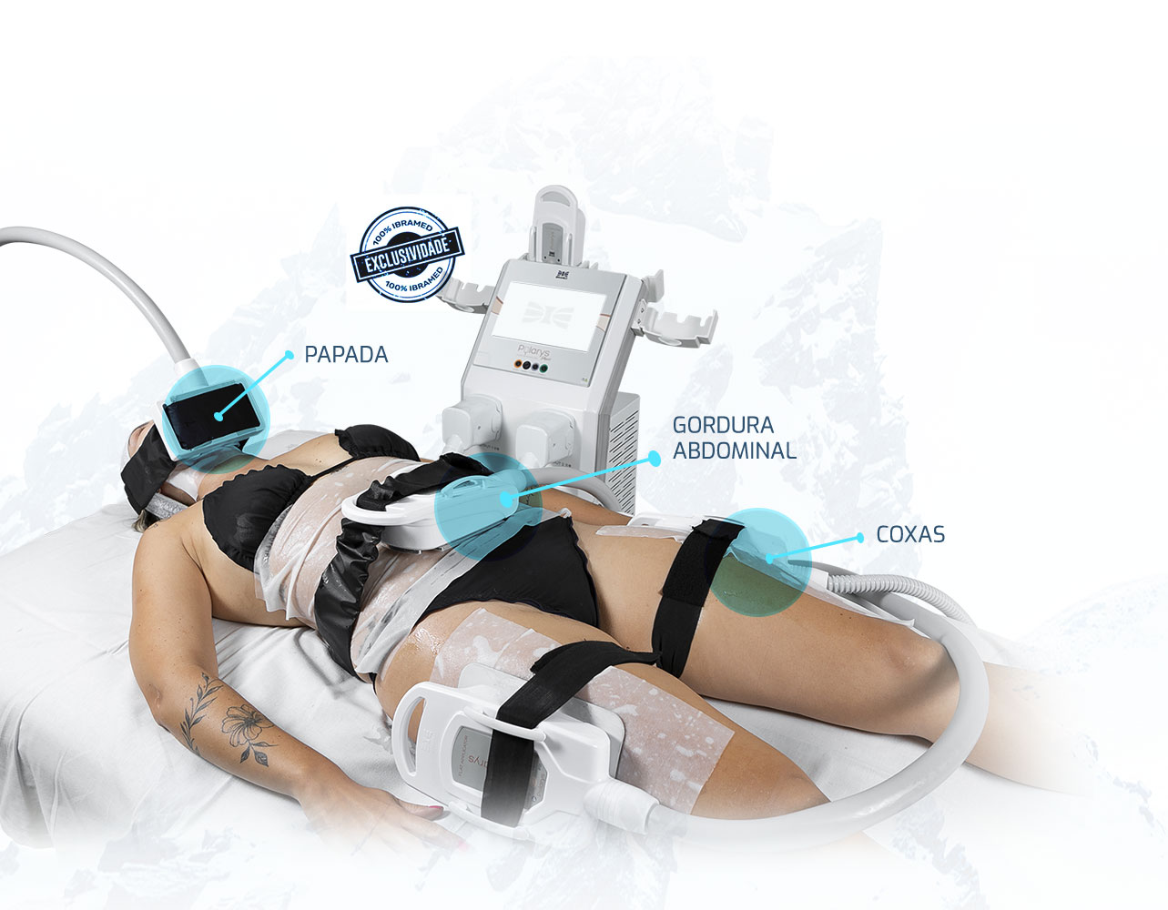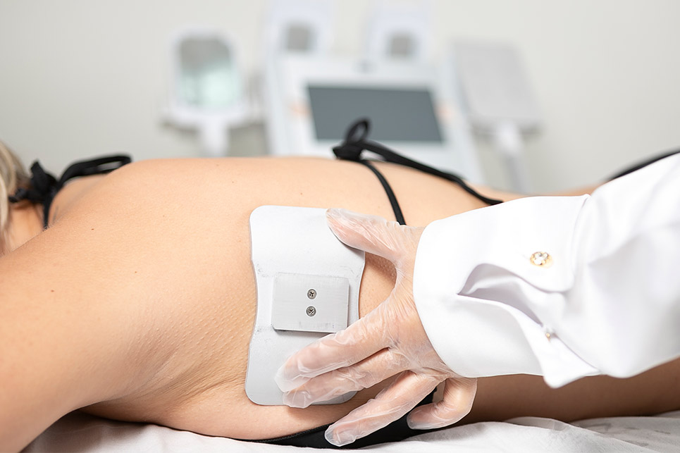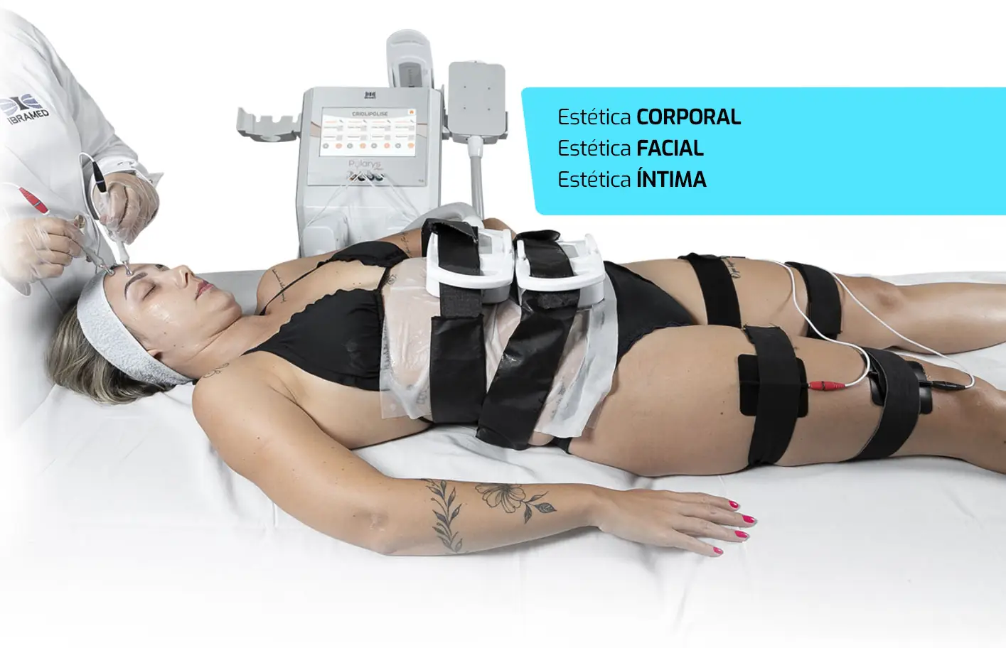 Único equipamento do mercado que possui um aplicador de Criolipólise + Eletroestimulação com adequação dos polos da corrente no mesmo local da criolipólise.
