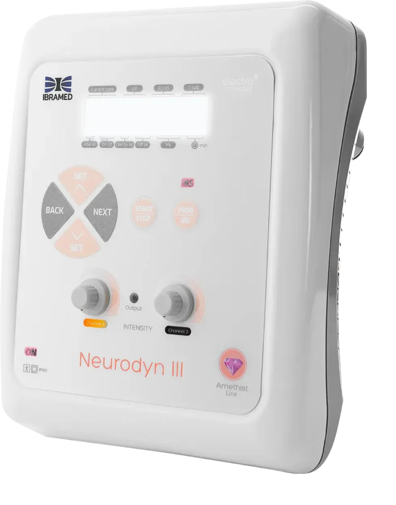 O Neurodyn III é um estimulador neuromuscular transcutâneo destinado aos tratamentos de reabilitação física.